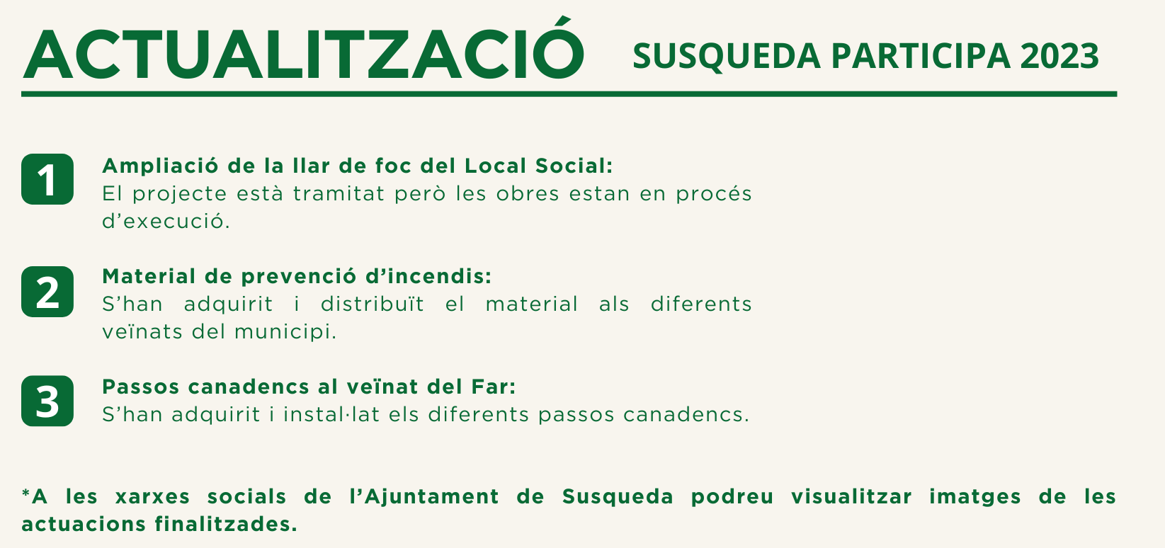 - FASE 3: VOTACIÓ FINAL. Un cop acotades les propostes finalistes, entre el 26 de juny i el 16 de juliol, les persones empadronades al municipi de Susqueda i de més de 16 anys van poder votar en aquesta última fase aquelles que volien executar. Una vegada més, la votació es va poder fer a través de la pàgina web o l’urna de cada veïnat.