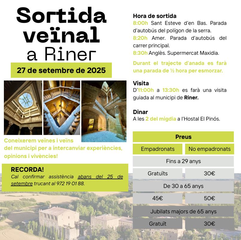 La sortida inclou el transport amb autocar (s’especifica l’hora de sortida al programa segons el veïnat), una visita guiada al municipi de Riner i també el dinar a l’Hostal El Pinós!